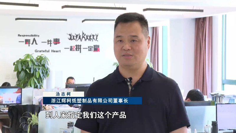 浙江辉柯纸塑制品有限公司董事长 汤志柯:我们从市场占有率无人知晓的地步,到人家指定我们这个产品。产值从几十万现在能够上升到千万以上。
